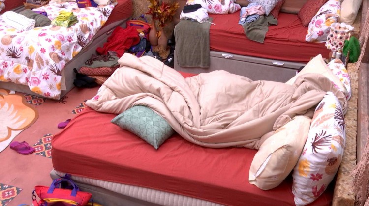 Após resultado da Prova do Anjo, que garantiu o colar de imunidade para Renata. No Quarto Nordeste do BBB 25, Camilla deita em sua cama, se cobre com o edredom e em seguida fala: