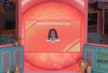 Na tarde deste sábado (15), os participantes Vinícius, Camilla e Joselma veem no telão a respost...